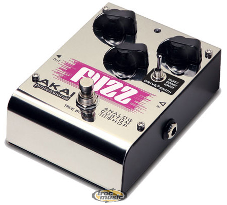 Pédale Fuzz avec contrôle du volume, contrôle de tonalité, et contrôle du gain dans un châssis en acier inoxydable poli.
