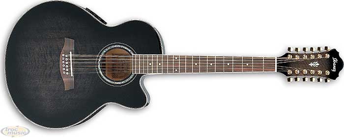 Guitare 12 cordes électro noir degradé transparent. Table sicomore flammé. Fond, éclisses et manche érable. Touche et chevalet palissandre. Micro Ibanez, preamp SRT.