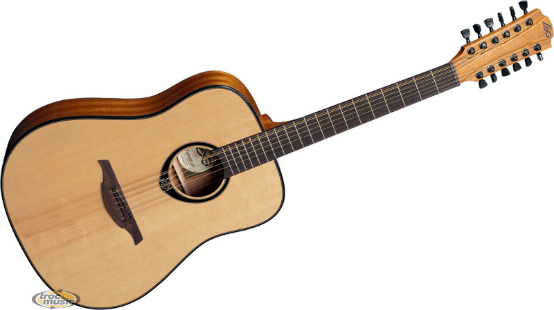Guitare folk 12 cordes, finition brillante. Table en épicéa, tête, dos et éclisses en acajou, filet noir et ivoire, manche finition French Satin, sillet de tête Graphite 47 mm.
