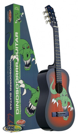 Guitare classique pour enfant taille 1/4, couleur rouge avec motif dinosaure. Table, Dos et Eclisses: tilleul. Manche: nato. Touche et Chevalet: érable massif peint en noir. Mécaniques: standards, nickelées. Finition: vernis brillant.