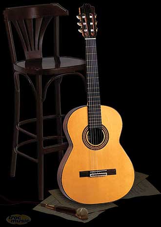 Table cèdre massif, fond, éclisses et chevalet palissandre, manche acajou, touche ébène.