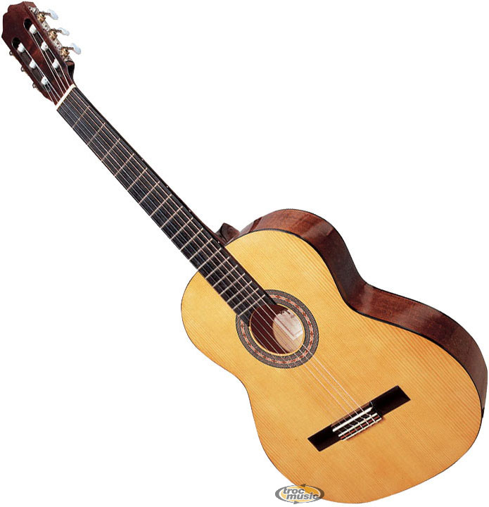 Guitare classique 4/4 pour gaucher, finition Naturelle. Table massive épicéa. Dos tilleul et éclisses hêtre. Manche érable avec touche acacia teinté. Mécaniques chromées. Equipées de cordes D'Addario classiques. Fabriquées en Europe.