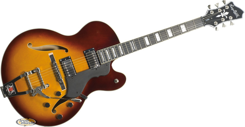 | Guitare électrique jazz Vibrola finition Vintage Sunburst. Manche : Collé en érable. Touche : Bois composite, repères Pearl Hagstrom. Tige de réglage H-Expander. Mécaniques : Hagstrom à bain d'huile. Diapason : 628 mm. Corps : Erable avec table bombée en érable. Micros : 2 micros Hagstrom HJ50. Electronique : 2 volumes, 2 tonalités, 1 sélecteur 3 positions. Chevalet : Vibrato Tremar Hagstrom. |