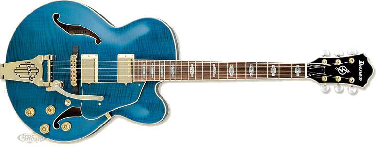 Guitare électrique demi caisse, bleu transparent. Micros Humbucker ACH2 (chevalet) + ACH1 (manche). Table, fond et éclisses sycomore flammé.