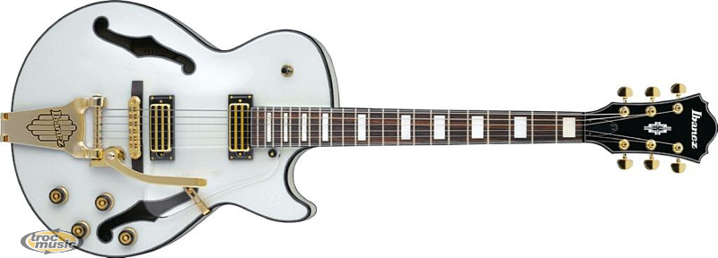 Guitare semi-acoustique - blanc brillant. Humbucker ACH4-M (chevalet) + humbucker ACH3-M (manche) - accastillage doré - table, fond et éclisses érable - épaisseur caisse 43mm - manche collé Artcore acajou - touche palissandre 22 cases - chevalet ART-1 et cordier VBF70 - plaque transparente.