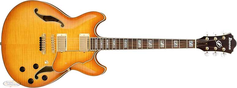 Guitare électrique demi caisse Vintage sunburst. 2 Micros humbucker Super 58 Custom (chevalet et manche). Table, fond et éclisses érable flammé.