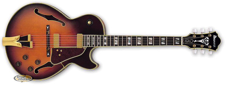 Guitare Jazz Série Signature George Benson - brun dégradé - avec étui. 2 Humbuckers GB Special - accastillage doré - table, fond et éclisses sapin - épaisseur caisse 65mm - manche GB Prestige érable - touche ébène 22 cases - chevalet ébène - plaque tortue.