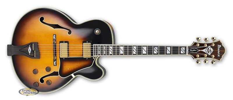 Guitare Série Signature George Benson - brun dégradé - avec étui. 2 Humbuckers Super 58 - accastillage doré - Table sapin - fond et éclisses érable - épaisseur caisse 80mm - manche GB Prestige acajou et érable - touche ébène 20 cases - chevalet ébène - plaque dégradée.