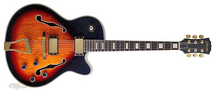 Guitare électrique Jazz Archtop violonburst. Corps demi caisse. Manche érable collé, touche palissandre 20 cases, 2 micros humbucker.