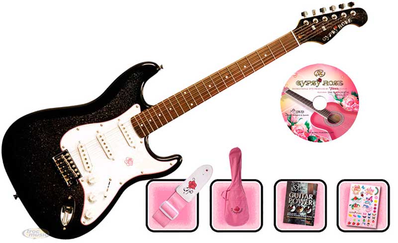 Guitare noire spécialement pour fille: taille 7/8, manche plus fin. Corps aulne massif, manche érable, électronique 2 volumes, 1 tonalité. Livré avec housse, sangle, DVD, autocollants, méthode.