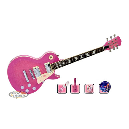 Guitare électrique taille 7/8 forme Les Paul rose. Corps aulne, manche érable, touche palissandre 22 frettes. Electronique: 2 volumes, 2 tonalités et 1 sélecteur de micro 3 positions. Livré avec accessoires.