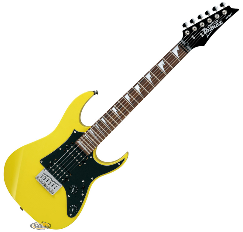 Mini guitare électrique jaune, avec étui. Humbucker STD-2 (chevalet) + humbucker STD-1 (manche) - accastillage chromé - corps nato - manche GRGM érable 22'' (56 cm)- touche palissandre 24 cases frets medium - incrustations dents de requin - chevalet fixe - plaque noire.