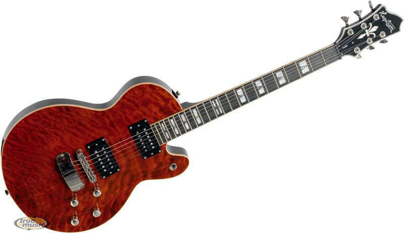 Guitare électrique type Les Paul. Corps acajou avec table bombée en érable pommelé et filet érable. Manche collé acajou. 2 Micros Hagstrom Custom 58.