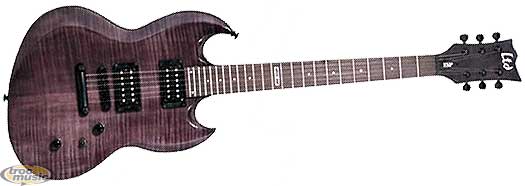 | Guitare électrique type SG, Noir transparent. Table et plaquage de téte en érable flammé. Corps en basswood. Manche 24 cases en érable. Touche en palissandre, frettes Jumbo. Repères par ''points'' nacrés incrustés avec nom du modèle à la 12ème case. 2 micros ESP-LH 150. Mécaniques à bain d'huile. Cordier Stop bar et chevalet Tune-O-Matic. Accastillage chromé. |