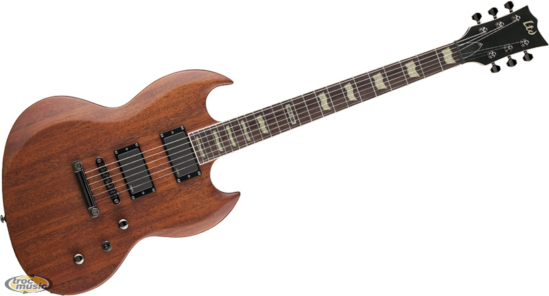 | Guitare électrique type SG finition Marron dégradé transparent. Corps en acajou. Manche collé 24 cases en acajou. Touche en palissandre, frettes Jumbo. Repères par ''drapeaux'', en abalone, incrustés avec nom du modèle à la 12ème case. Micros EMG81 ET EMG85, électronique active. Mécaniques à bain d'huile. Accastillage nickel noir. |