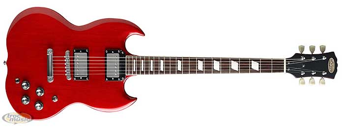 Guitare rock type SG, 2 micros humbucker, sélecteur 3 positions, 2 volume/tonalité, corps et manche acajou, touche palissandre 22 cases.