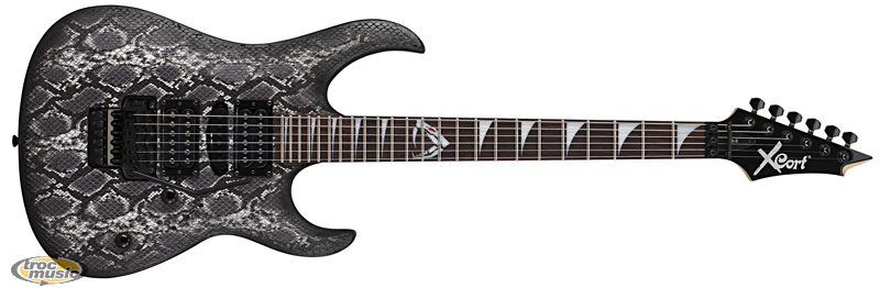 Corps tilleul avec table ''peau de serpent''. Manche 5 pièces érable. Touche palissandre. 1 micro simple et 2 doubles Cort Bluebucker. Vibrato double blocage. Accastillage noir.