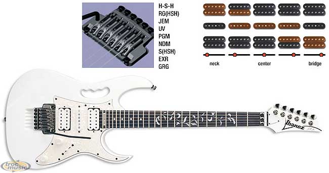 Guitare électrique Signature Steve Vai, blanche. Manche prestige vissé 24 cases, micros 2 doubles + 1 simple DiMarzio Evolution, Vibrato Edge Pro.