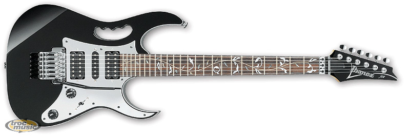 Guitare électrique noire série Signature Steve Vai, livrée avec étui. Humbucker DiMarzio Breed-R (manche) + single coil DiMarzio Breed-S (central) + humbucker DiMarzio Breed (chevalet). Accastillage chromé. Corps tilleul américain. Manche JEM Prestige érable et noyer. Touche palissandre 24 frettes W6105 avec incrustations ''Arbre de Vie'' abalone. Vibrato Edge Pro. Plaque aluminium.