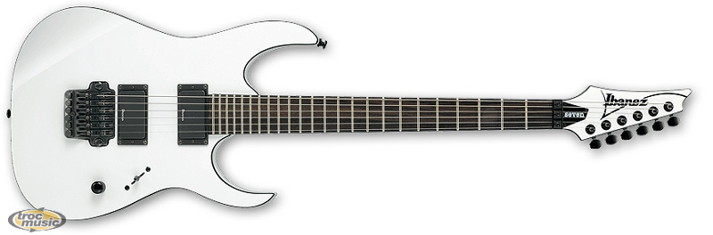 Série Signature Mick Thomson - Slipknot - blanche - avec étui. Humbucker covered V8 (chevalet) + Humbucker covered V7 (manche) - accastillage noir - corps acajou - manche Wizard II érable et noyer - tête reverse et logo ''Seven'' - touche palissandre 24 cases Frettes jumbo - Chevalet fixe Fixed Edge III.