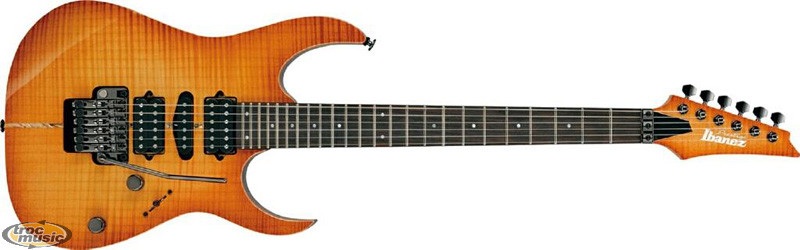 Guitare électrique Prestige Japan - violon antique - avec étui. Humbucker DiMarzio Air Norton (manche) + humbucker DiMarzio Tone Zone (vibrato) + single coil DiMarzio True Velvet (central) - accastillage chrome noir - corps acajou avec table érable flammée et incrustation centrale en abalone - manche Ultra Wizard Prestige érable/noyer - touche palissandre 24 cases jumbo - incrustations dots - vibrato Edge Zero avec système ZPS3.