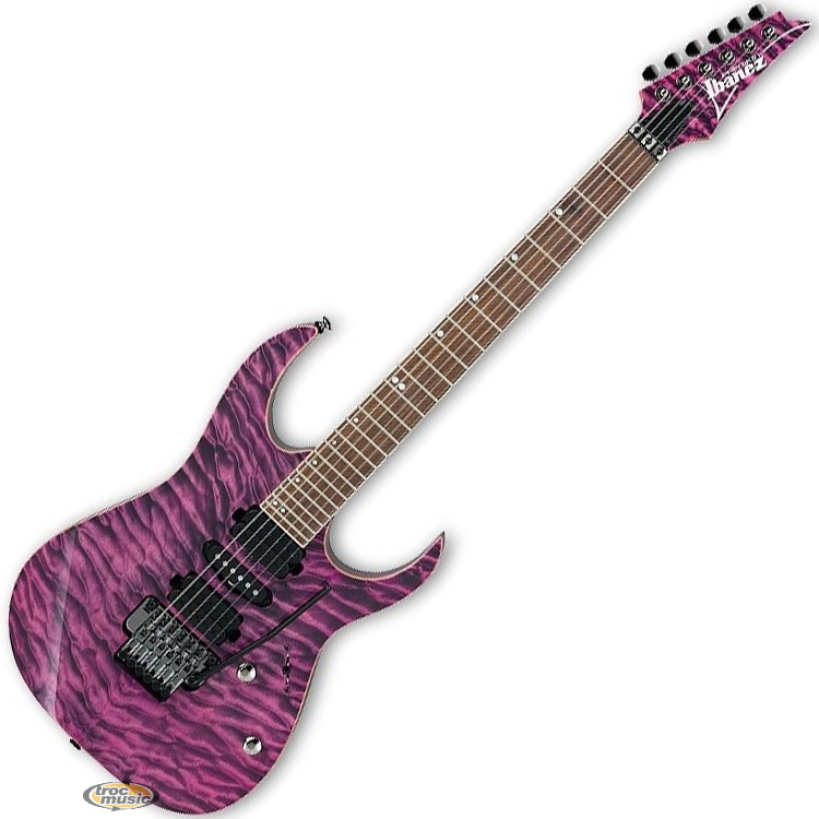 Guitare électrique RG Premium violet transparent avec softcase. Humbucker VM2 (vibrato) + humbucker VM1 (manche) + single coil VM1S (central) - accastillage chromé - corps tilleul américain - table érable ondé - manche Wizard 5 pièces érable/noyer - touche palissandre 24 cases jumbo - incrustations dots - vibrato Edge Zero II.