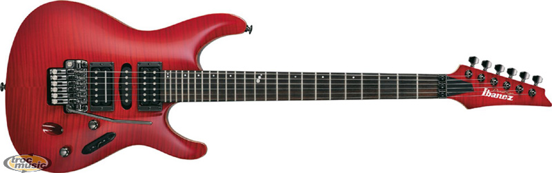 Guitare électrique Prestige Japan - flammé rouge - avec étui. Humbucker IBZ HGD2 (chevalet) + single coil IBZ ST1 (centre) + humbucker IBZ HGD1 (manche) - accastillage chrome noir - corps acajou - table érable flammée - manche Super Wizard HP Prestige 5 parties érable et noyer - touche palissandre 24 cases frets jumbo - vibrato ZR-2.