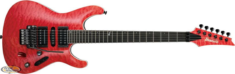 Guitare électrique Prestige Japan - rouge transparent - avec étui. Humbucker IBZ HGD2 (chevalet) + single coil IBZ ST1 (centre) + humbucker IBZ HGD1 (manche) - accastillage chrome noir - corps acajou - table érable ondé - manche Super Wizard HP Prestige 5 parties érable et noyer - touche palissandre 24 cases frets jumbo - vibrato ZR-2.