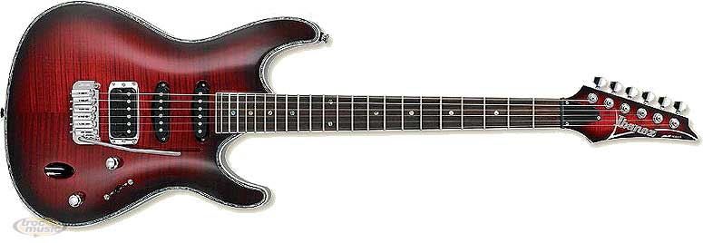 Guitare électrique avec corps acajou, table érable flammé, manche collé SA érable. Micros: 2 single coils + 1 humbucker. Finition: Transparent red sunburst.