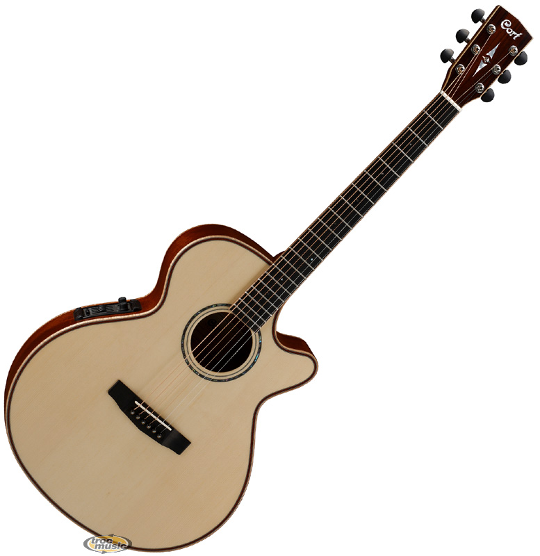Guitare folk électro-acoustique CORT de la série AS. Forme : SFX. Table : épicéa Engelmann massif. Fond & éclisses : acajou massif. Manche : acajou. Touche & chevalet : ébène. Diapason: 643 mm. Sillet: 43 mm. Binding érable et purfling acajou. Préampli : EQ Fishman Prefix Plus T. Livrée en étui.