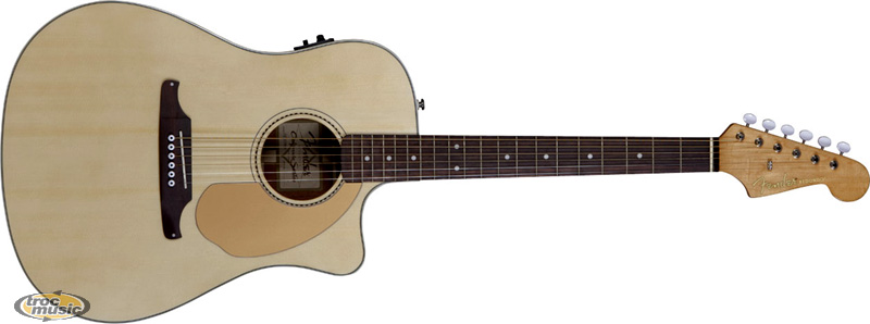 Guitare électro-acoustique série California, finition naturelle. Forme Dreadnought Cutaway. Table en épicéa laminé. Dos et eclisses acajou laminé. Barrage en X sculpté. Manche érable. Touche palissandre. 20 frettes. Système Fishman Isys III. Contrôles Volume, Graves, Médiums, aigus, Indicateur de batterie faible.