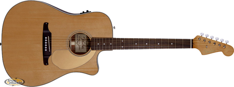 | Guitare électro-acoustique folk Série California, édition 2012. Forme dreadnought, caisse fine. Table en épicéa massif. Dos et éclisses en acajou. Manche en érable. Touche palissandre. 20 frettes. Barrage en X allégé. Electronique: Fishman Isys III System + accordeur. Chevalet en palissandre avec sillet compensé en os. Finition vernis brillant naturel. |