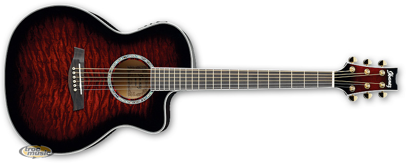 Table, dos et éclisses : érable pommelé. Manche : acajou. Micros : Fishman Sonicore. Preamp : Fishman Presys Blend avec micro interne intégré et accordeur. Mécaniques : Gold Grover. Sillet de tête et de Chevalet : Ibanez Ivorex II. Rosace : Abalone. Touche : Palissandre. Finition Transparent Black Cherry Sunburst.