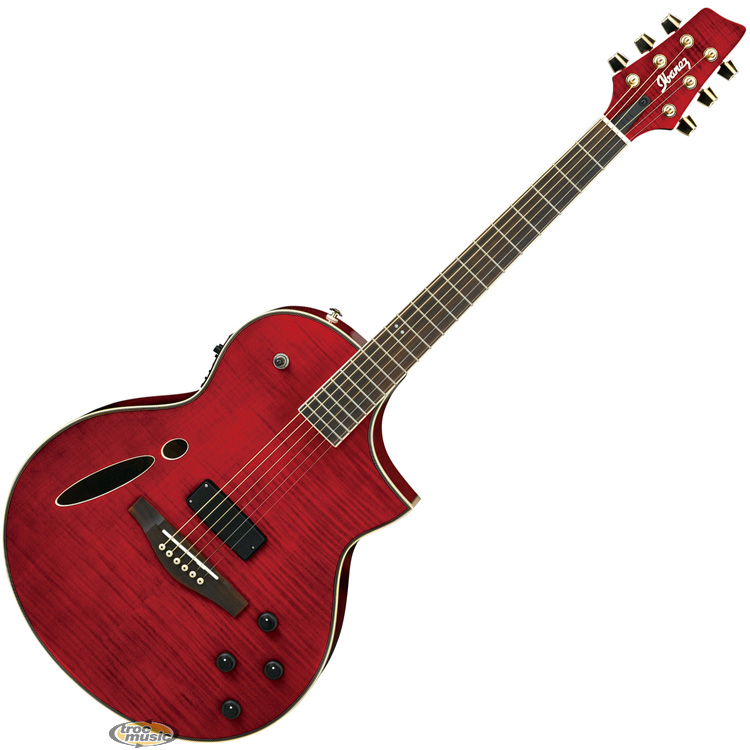 | Guitare folk électro-acoustique à pan coupé, finition rouge transparent. Table, fond et éclisses érable flammé - manche collé acajou - touche et chevalet palissandre - micro magnétique Ibanez AP10 + micro sous le sillet - préamp Ibanez Original M300 avec accordeur et distorsion - sillet et chevalet Ivorex II - mécaniques Smooth Tuner AS dorées. |