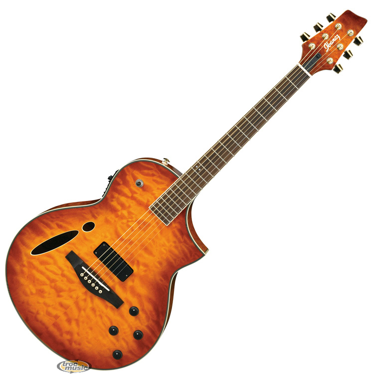 | Guitare folk électro-acoustique à pan coupé, naturel dégradé. Table, fond et éclisses érable ondé - manche collé acajou - touche et chevalet palissandre - micro magnétique Ibanez AP10 + micro sous le sillet - préamp Ibanez Original M300 avec accordeur et distorsion - sillet et chevalet Ivorex II - mécaniques Smooth Tuner AS dorées. |