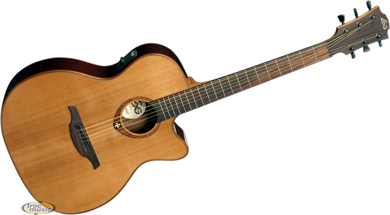 Guitare électro folk série Stage, finition naturelle, vernis brillant. Table cèdre rouge massif. Manche, dos et éclisses acajou. Tête, touche et chevalet palissandre d'Indonésie. Electronique : Préampli StudioLâg & micro piezo NanoFlex.