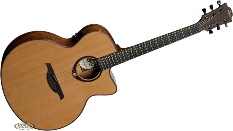 Guitare électro-acoustique Jumbo Cutaway finition French Satin. Table massive en cèdre rouge, dos et éclisses en acajou, filets en palissandre et en érable. Préampli StudioLâg Plus & micro piezo NanoFlex.