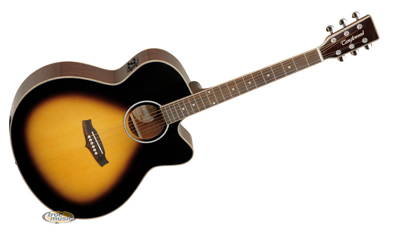Table épicéa. Dos et éclisses en acajou. Touche en palissandre. Mécaniques type Grover chromées. Finition Vintage Sunburst brillante. Rosace abalone. Fishman ION-T.