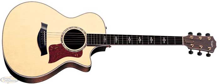 Guitare électro-acoustique pan coupé Taylor Grand Auditorium série 800. Table massive en épicéa sitka. Dos et éclisses en palissandre Indien massif. Touche, chevalet et chevilles en ébène. Préampli Expression System.