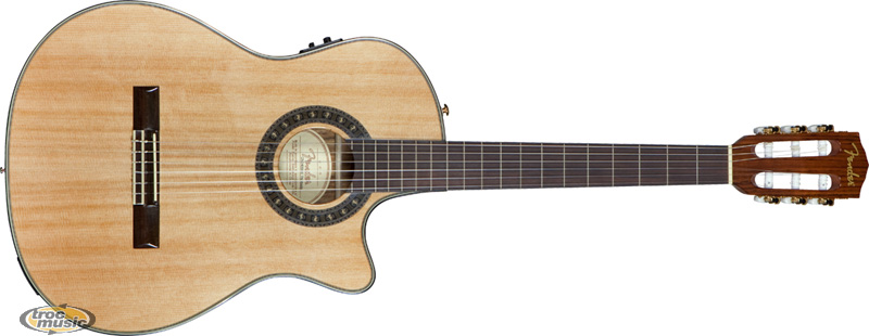 | Guitare électro-classique à pan coupé. Dos et éclisses en palissandre laminé. Table d'harmonie en cèdre massif. Finition du corps: Gloss. 18 Frettes. Touche palissandre. Manche acajou. Largeur au sillet: 1.69'' (43 mm). Longueur du diapason: 23.3'' (592 mm). Eléctronique: Système Fishman Isys III. Contrôles: Contrôle de volume, égalisation 3-Bandes, et balayage des médiums. |