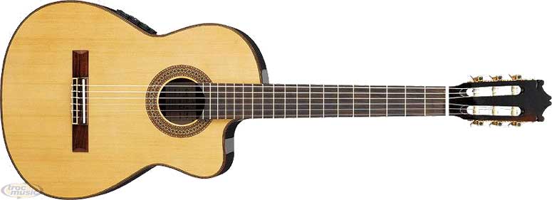 Guitare électro-nylon naturelle, pan coupé. Table spruce massif. Fond, éclisses et manche acajou. Micro B-Band UST, préamp Ibanez SRTn.