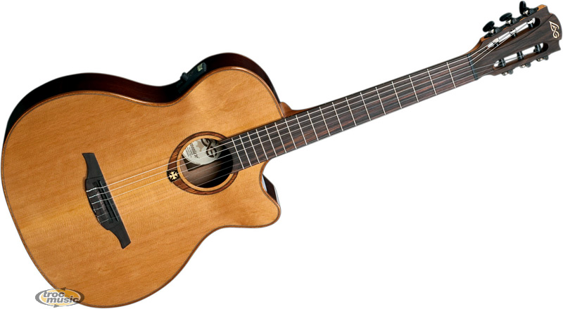 Guitare électro-acoustique nylon série Stage, finition vernis brillant. Table cèdre rouge massif. Manche, dos & éclisses acajou, avec filets acajou, érable et noir. Tête, touche et chevalet palissandre d'Indonésie. Cordes D'Addario. Electronique : Préampli StudioLâg & micro piezo NanoFlex.
