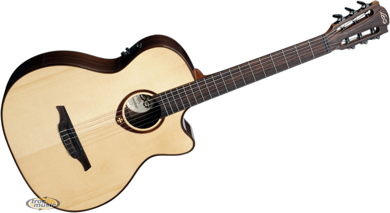| Tête : Palissandre d'Indonésie. Mécaniques : Classiques, noir satin avec boutons ''Tulipe''. Sillet de tête : Graphite, 48 mm. Tige de réglage : Double sens. Manche : Acajou finition dorée satinée. Touche : Palissandre d'Indonésie, finition huile de lin. Frettes : 18, silver-nickel, médium. Table : Epicéa de Sitka massif. Rosace avec croix occitane. Dos & Eclisses : Palissandre d'Indonésie, avec filets palissandre et érable. Chevalet : Palissandre d'Indonésie. Sillet de chevalet : Compensé en graphite. Finition : Vernis brillant. Cordes : D'Addario. Electronique : Préampli StudioLâg Plus & micro piezo NanoFlex. |
