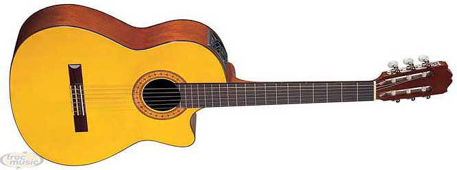 Guitare classique électro-acoustique avec pan coupé. Table épicéa, dos et éclisses meranti, touche et chevalet palissandre. Micro piezo et 2 curseurs volume et tonalité.