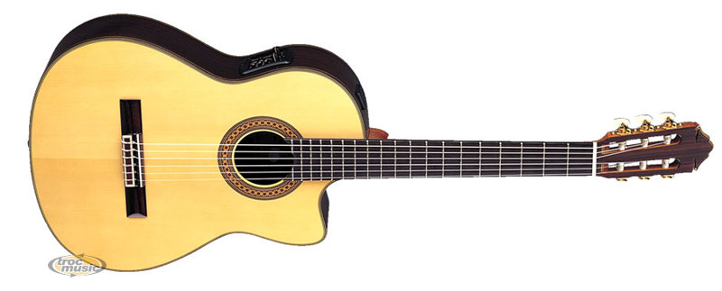 Ligne Grand Concert. Table épicéa massif d'Europe. Dos et éclisses palissandre des Indes. Manche acajou, touche ébène. Système électro-acoustique : micro piezo + micro aérien interne, preamp System 49.