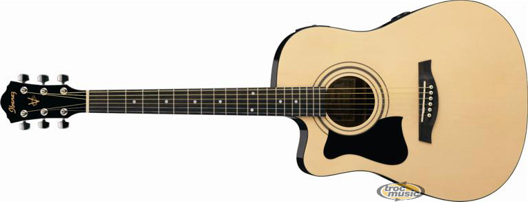 Guitare folk électro-acoustique gaucher finition naturelle. Type : Cutaway Dreadnought. Table : Épicéa. Dos, éclisses et manche : Acajou. Micro : Ibanez, sous le Chevalet. Preamp : Ibanez AEQ200T, avec accordeur intégré.