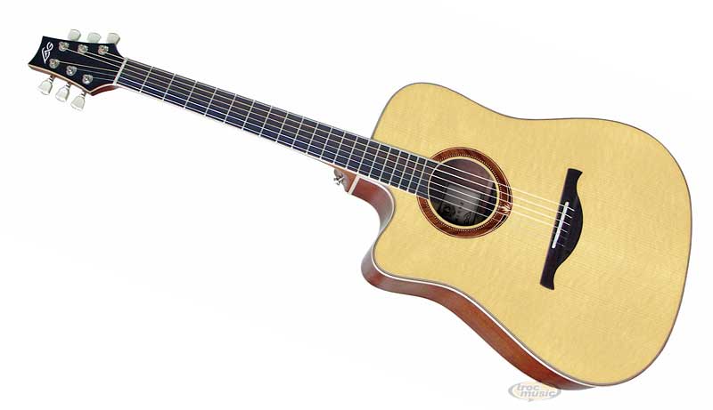Guitare électro-acoustique dreadnought gaucher. Table épicéa, manche nato, dos et éclisses acajou. Préampli Studiolag et micro NanoMag.