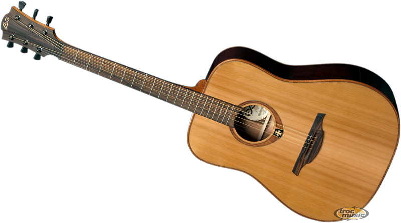 Table en cèdre rouge massif. Manche, dos et éclisses en acajou. Tête, touche et chevalet en palissandre d'Indonésie. Finition vernis brillant.