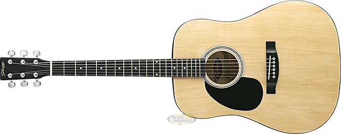 Guitare acoustique gaucher type dreadnought. Table, dos et éclisses tilleul, manche nato. Disponible en finition Natural ou Black.