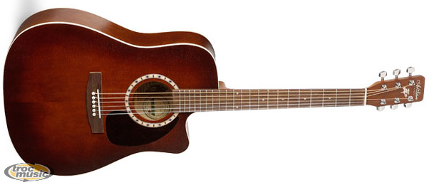 Guitare folk modèle à pan coupé ( Cutaway ), fabriquée à la main au CanadA. Fond et Éclisses : Merisier. Manche : Érable argenté. Table : Cèdre massif (testé pour la pression). Touche et Pont: Palissandre. Fini : fini vernie sur mesure Semi-lustré. Sillet de tête et de pont en Tusq de Graphtech.